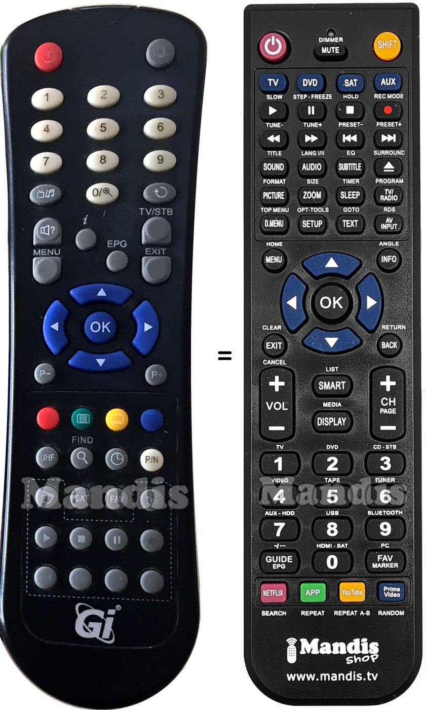 Below, we will show you the correspondence between each button on the original remote control and the button that performs the same function on the replacement remote control. In some cases, you may need to press the SHIFT key before pressing another button to perform certain actions. These additional functions are often not widely used and are included to facilitate understanding of the replacement remote control, or because the original remote control has more buttons than its equivalent.