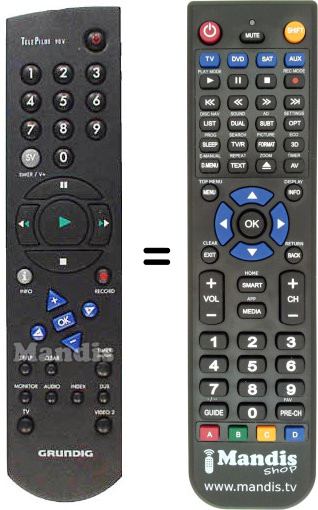 Attention: his equivalent remote control replaces the original remote control. The original remote control allows you to control a Grundig TV and also has two additional codes to control two video recorders (VCRs). To ensure equivalent functionality, the equivalent remote control also includes three codes. By pressing the upper blue "TV" button, the code to control the Grundig TV is selected. By pressing the upper blue "DVD" and/or "SAT" buttons, the code to control each of the two video recorders (VCRs), also Grundig brand, is selected.