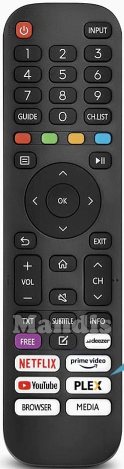 Power, Input, 1, 2, 3, 4, 5, 6, 7, 8, 9, 0, Guide, CH.List, Red, Green, Yellow, Blue, [=], Play/Pause, Exit, Back, Up, Down, Right, Left, OK, Home, Mute, TXT, Subtitle, Info, [ '], Free, deezer, prime video, Netflix, YouTube, Plex, Media, Browser, Vol+, Vol-, CH+, CH-