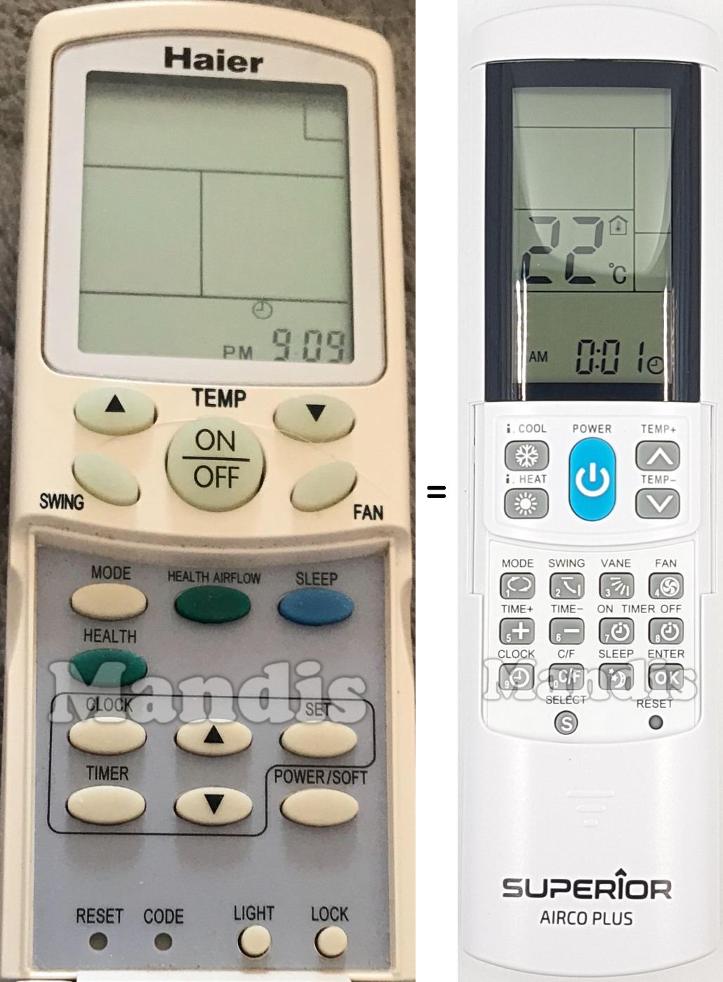My LG air-conditioner's remote died and need replacement. AircoPlus did the job. I should point out that the code match did not correspond according to manufacturer's table. Let the auto-search code set up do the work. Also, excellent service by Mandis Remotes with a well-protected package.