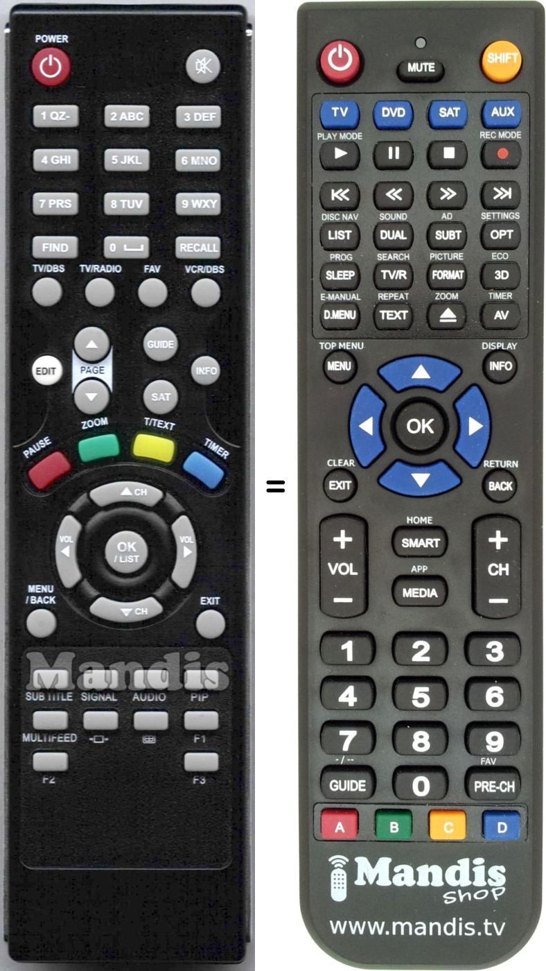 Below, we will show you the correspondence between each button on the original remote control and the button that performs the same function on the replacement remote control. In some cases, you may need to press the SHIFT key before pressing another button to perform certain actions. These additional functions are often not widely used and are included to facilitate understanding of the replacement remote control, or because the original remote control has more buttons than its equivalent.