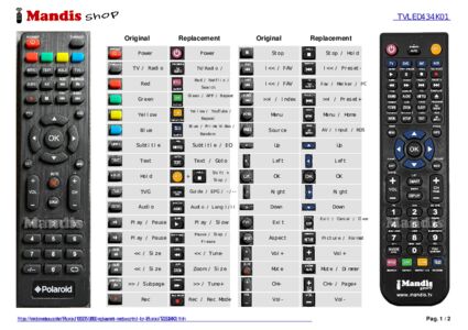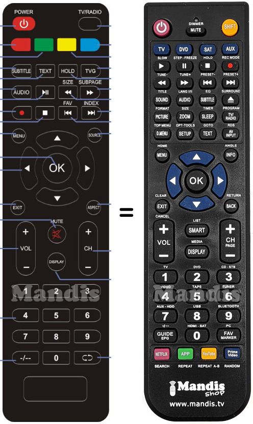 Below, we will show you the correspondence between each button on the original remote control and the button that performs the same function on the replacement remote control. In some cases, you may need to press the SHIFT key before pressing another button to perform certain actions. These additional functions are often not widely used and are included to facilitate understanding of the replacement remote control, or because the original remote control has more buttons than its equivalent.