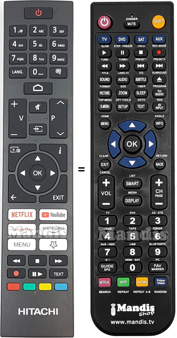 Below, we will show you the correspondence between each button on the original remote control and the button that performs the same function on the replacement remote control. In some cases, you may need to press the SHIFT key before pressing another button to perform certain actions. These additional functions are often not widely used and are included to facilitate understanding of the replacement remote control, or because the original remote control has more buttons than its equivalent.