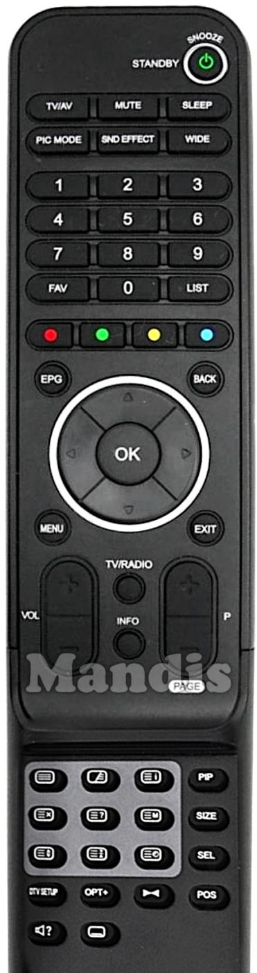 Standby / Snooze, TV/AV, Mute, Sleep, PIC Mode, SND Effect, Wide, 1, 2, 3, 4, 5, 6, 7, 8, 9, 0, Fav, List, Red, Green, Yellow, Blue, EPG, Back, Up, Left, OK, Right, Down, Menu, Exit, Vol+, Vol-, TV/Radio, Info, P+, P-, [≡], [ /≡], [≡i], [≡X], [≡?], [≡M], [≡↕], [≡⧗], [≡◷], PIP, Size, Sel, Pos, DTV Setup, OPT+, ▶◀, Audio, Subtitle