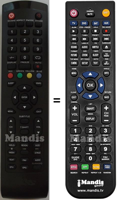 Below, we will show you the correspondence between each button on the original remote control and the button that performs the same function on the replacement remote control. In some cases, you may need to press the SHIFT key before pressing another button to perform certain actions. These additional functions are often not widely used and are included to facilitate understanding of the replacement remote control, or because the original remote control has more buttons than its equivalent.