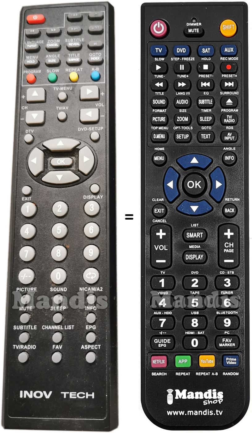 Below, we will show you the correspondence between each button on the original remote control and the button that performs the same function on the replacement remote control. In some cases, you may need to press the SHIFT key before pressing another button to perform certain actions. These additional functions are often not widely used and are included to facilitate understanding of the replacement remote control, or because the original remote control has more buttons than its equivalent.