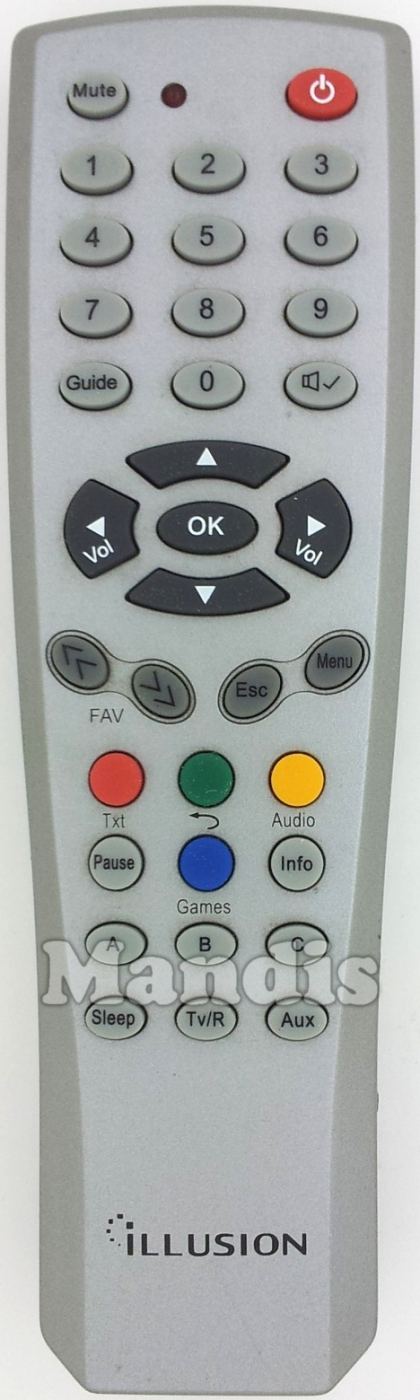 Mute, Power, 1, 2, 3, 4, 5, 6, 7, 8, 9, 0, Guide, Vol, Up, Down, Vol-, Vol+, OK, FAV+, FAV-, Esc, Menu, Red/Txt, Green/Back, Yellow/Audio, Pause, Blue/Games, Info, A, B, C, Sleep, Tv/R, Aux
