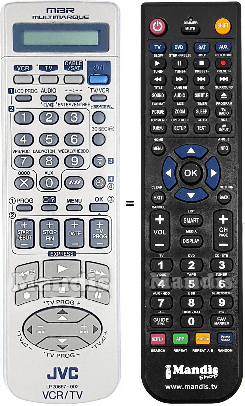 Below, we will show you the correspondence between each button on the original remote control and the button that performs the same function on the replacement remote control. In some cases, you may need to press the SHIFT key before pressing another button to perform certain actions. These additional functions are often not widely used and are included to facilitate understanding of the replacement remote control, or because the original remote control has more buttons than its equivalent.