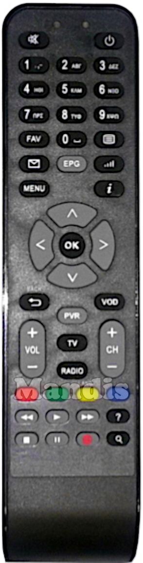 Power, Mute, 1, 2, 3, 4, 5, 6, 7, 8, 9, 0, Fav, Text, Messages, EPG, .:I, Menu, i, Up, Left, OK, Right, Down, Back, VOD, PVR, Vol+, Vol-, TV, Radio, CH+, CH-, Red, Green, Yellow, Blue, <<, Play, >>, Stop, Pause, Rec, ?, Search