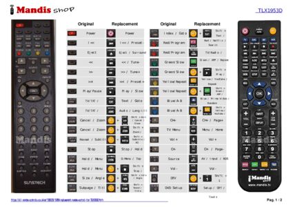 Below, we will show you the correspondence between each button on the original remote control and the button that performs the same function on the replacement remote control. In some cases, you may need to press the SHIFT key before pressing another button to perform certain actions. These additional functions are often not widely used and are included to facilitate understanding of the replacement remote control, or because the original remote control has more buttons than its equivalent.