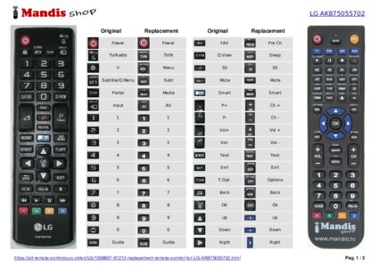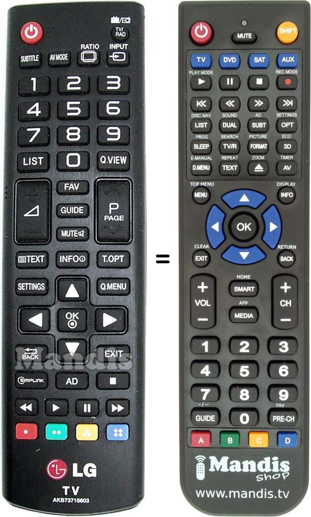 This remote control performs all the functions of the original remote control: Power, TV / Rad, Subtitle, AV Mode, Ratio, Input, 1, 2, 3, 4, 5, 6, 7, 8, 9, 0, List, Q.View, Vol +, Vol -, Fav, Guide, Mute, P+ / Page +, P- / Page -, Text, Info, T.Opt, Settings, Q.Menu, Up, Right, Down, Left, OK, Back, Exit, Simplink, AD, Stop, <<, Play, Pause, >>, Red, Green, Yellow, Blue