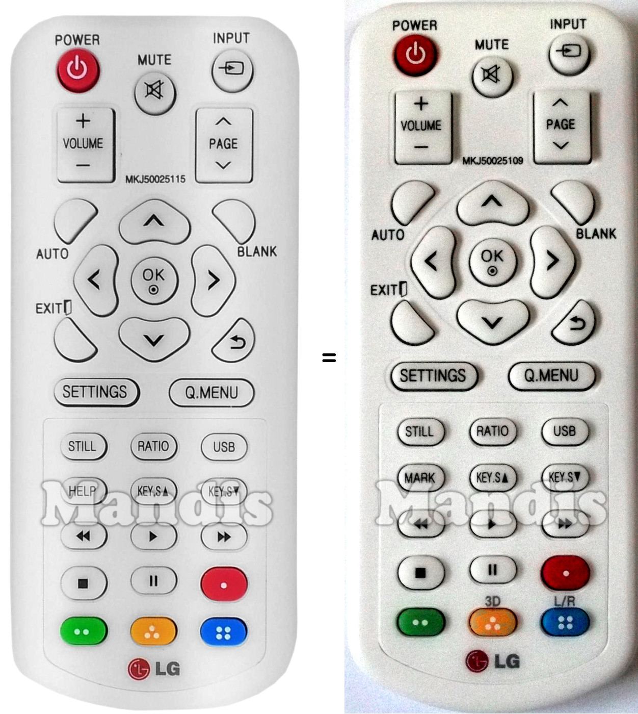 This remote control has the following buttons: Power, Mute, Input, Volume +, Volume -, Page +, Page -, Auto, Blank, Up, Right, Down, Left, OK, Exit, Back, Settings, Q.Menu, Still, Ratio, USB, Mark, Key.S Up, Key.S Down, <<, Play, >>, Stop, Pause, Red, Green, Yellow / 3D, Blue / L/R