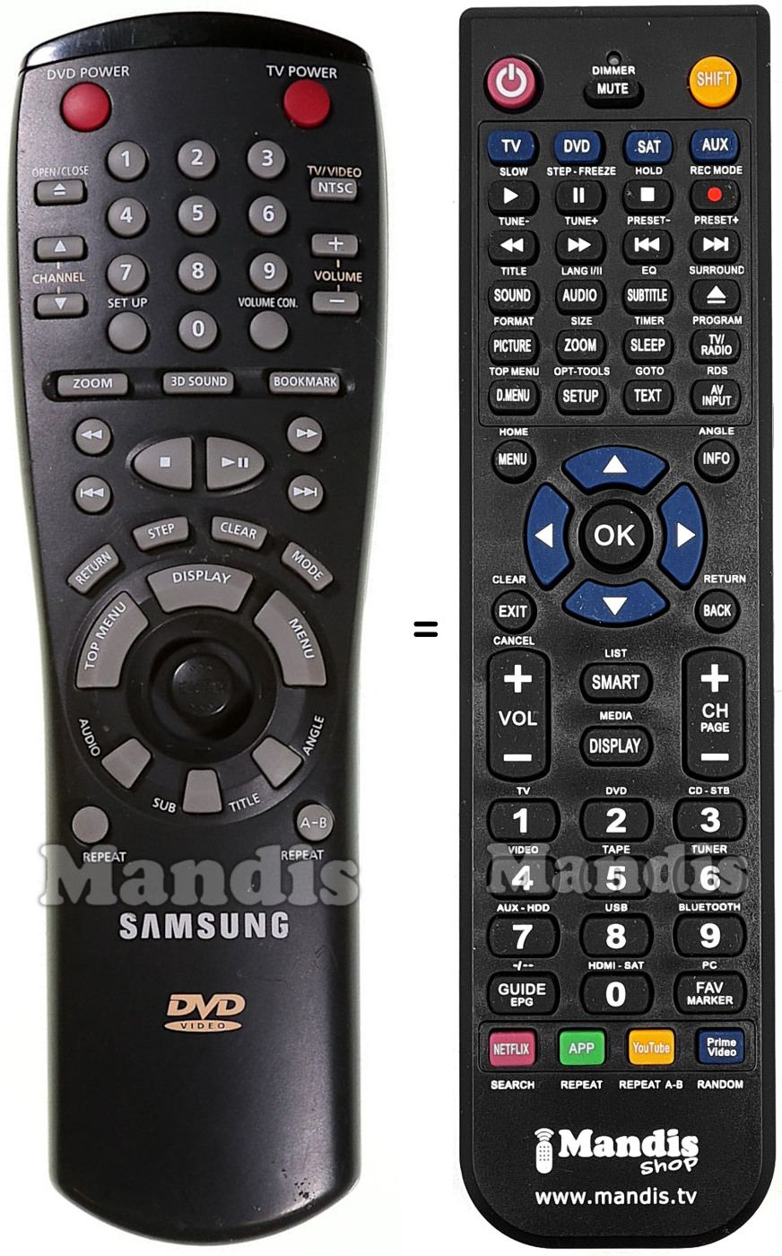 Below, we will show you the correspondence between each button on the original remote control and the button that performs the same function on the replacement remote control. In some cases, you may need to press the SHIFT key before pressing another button to perform certain actions. These additional functions are often not widely used and are included to facilitate understanding of the replacement remote control, or because the original remote control has more buttons than its equivalent.
