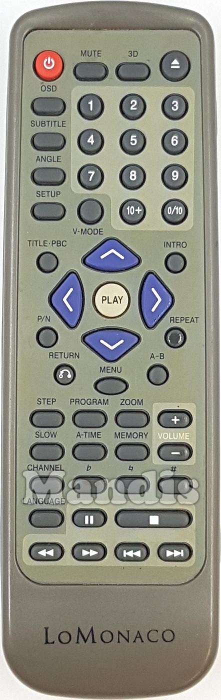 Power, Mute, 3D, Open/Close, OSD, Subtitle, Angle, Setup, 1, 2, 3, 4, 5, 6, 7, 8, 9, 10+, 0/10, V-Mode, Title-PBC, Intro, Repeat, P/N, Up, Down, Right, Left, Play, A-B, Return, Menu, Step, Program, Zoom, Volume+, Volume-, Memory, A-Time, Slow, Channel, b, =I, #, Stop, Pause, Language, <<, >>, I<<, >>I