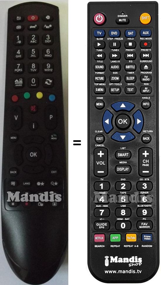 Below, we will show you the correspondence between each button on the original remote control and the button that performs the same function on the replacement remote control. In some cases, you may need to press the SHIFT key before pressing another button to perform certain actions. These additional functions are often not widely used and are included to facilitate understanding of the replacement remote control, or because the original remote control has more buttons than its equivalent.