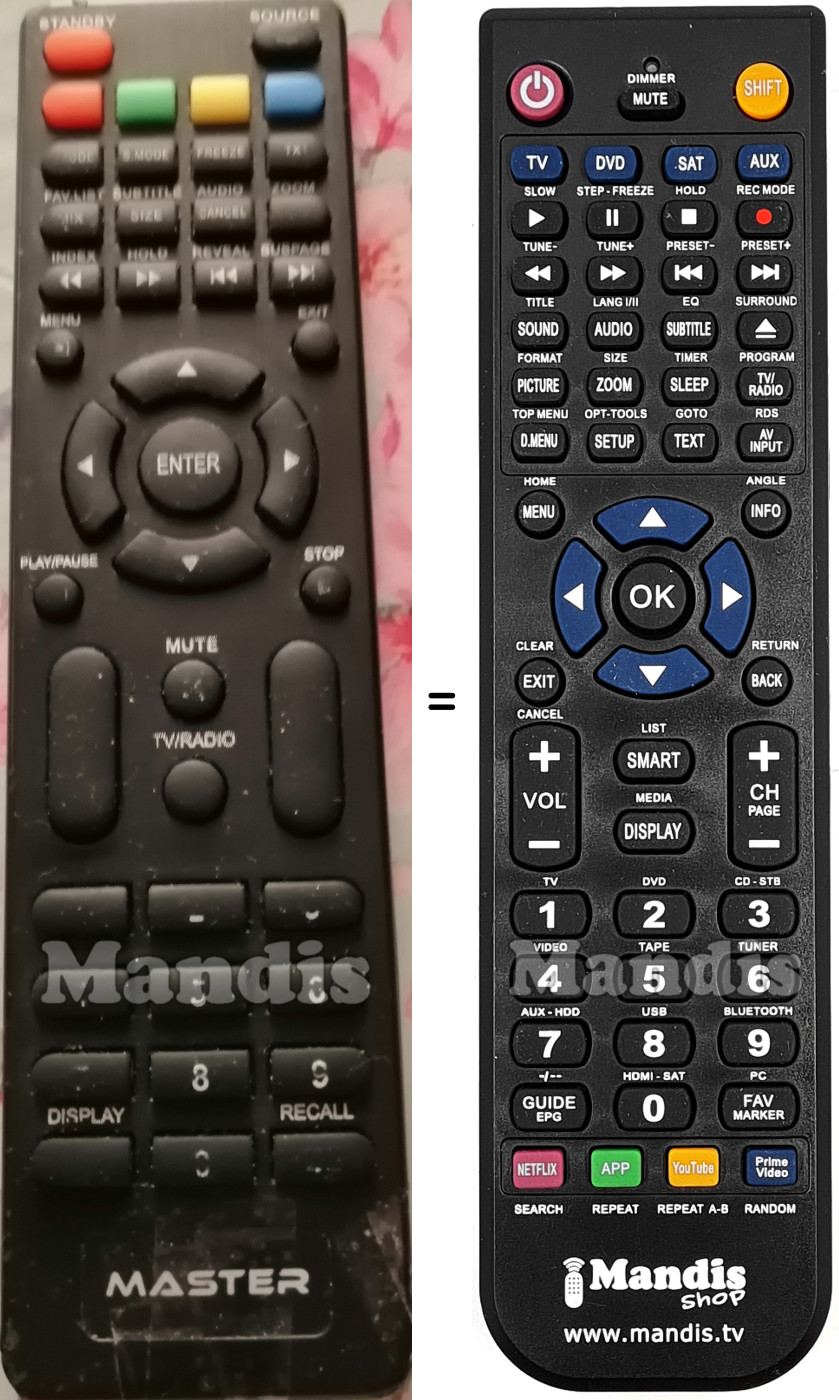 Below, we will show you the correspondence between each button on the original remote control and the button that performs the same function on the replacement remote control. In some cases, you may need to press the SHIFT key before pressing another button to perform certain actions. These additional functions are often not widely used and are included to facilitate understanding of the replacement remote control, or because the original remote control has more buttons than its equivalent.