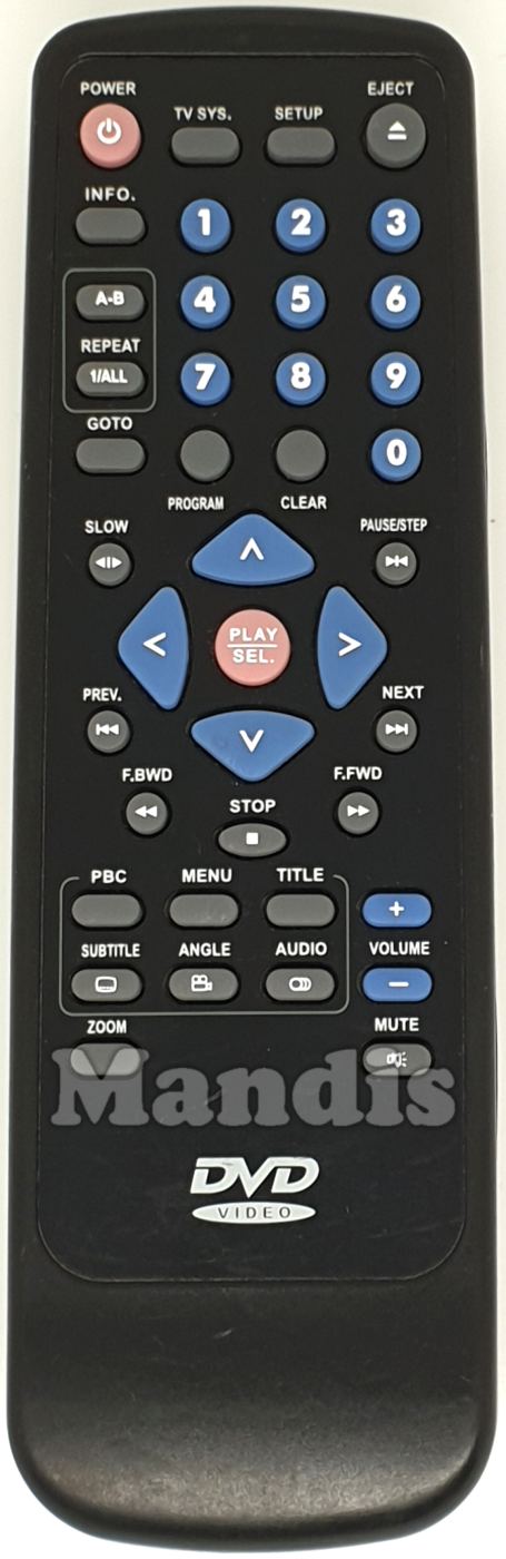 Power, TV SYS., Setup, Eject, Info., 1, 2, 3, 4, 5, 6, 7, 8, 9, 0, A-B, 1/ALL/Repeat, GOTO, Program, Clear, Slow <I>, Pause/Step >I<, I<< , >>I, <<, Stop, >>, Up, Down, Left, Right, Play/Sel., PBC, Menu, Title, Subtitle, Angle, Audio, Zoom, Volume+, Volume-, Mute