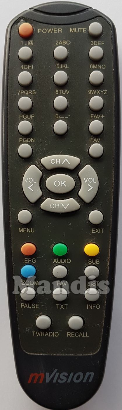 Power, Mute, 1, 2, 3, 4, 5, 6, 7, 8, 0, 9, PgUp, PgDn, FAV+, FAV-, Up/CH+, Down/CH-, Left/Vol-, Right/Vol+, OK, Menu, Exit, Red/EPG, Green/Audio, Yellow/Sub, Blue/Zoom, FAV, List, Pause, TXT, Info, Tv/Radio, Recall