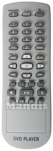 POWER, OPEN/CLOSE, DISPLAY, 1, 2, 3, 4, 5, 6, 7, 8, 9, 0, TITLE/RETURN, SEARCH, MENU/DISC, SETUP, I<<, >>I, OK, UP, DOWN, RIGHT, LEFT, SUBTITLE, AUDIO, ANGLE, ZOOM, STOP, MUTE, PLAY/PAUSE, REPEAT, REPEAT A-B, I> SLOW, STEP