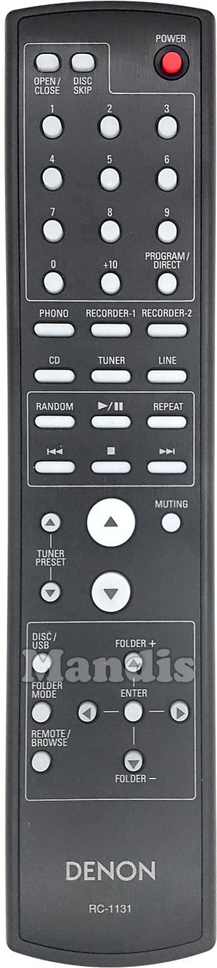 Power, Open / Close, Disc Skip, 1, 2, 3, 4, 5, 6, 7, 8, 9, 0, +10, Program / Direct, Phono, Recorder-1, Recorder-2, CD, Tuner, Line, Random, Play / Pause, Repeat, I<<, Stop, >>I, Tuner+ / Preset+, Tuner- / Preset-, Vol+, Vol-, Muting, Disc / USB, Folder Mode, Remote / Browse, Up / Folder+, Down / Folder-, Right, Left, Enter