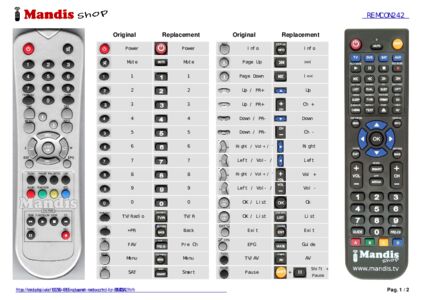Below, we will show you the correspondence between each button on the original remote control and the button that performs the same function on the replacement remote control. In some cases, you may need to press the SHIFT key before pressing another button to perform certain actions. These additional functions are often not widely used and are included to facilitate understanding of the replacement remote control, or because the original remote control has more buttons than its equivalent.