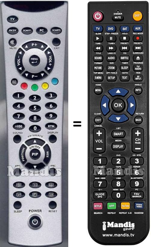 Below, we will show you the correspondence between each button on the original remote control and the button that performs the same function on the replacement remote control. In some cases, you may need to press the SHIFT key before pressing another button to perform certain actions. These additional functions are often not widely used and are included to facilitate understanding of the replacement remote control, or because the original remote control has more buttons than its equivalent.