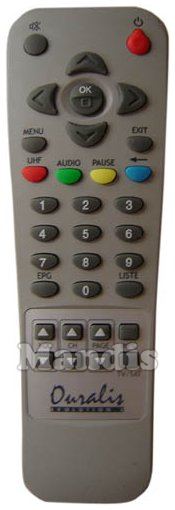 Power, Mute, Up, Down, Right, Left, OK, Menu, Exit, Red / UHF, Green / Audio, Yellow / Pause, Blue / <--, 1, 2, 3, 4, 5, 6, 7, 8, 9, 0, EPG, Liste, Vol +, Vol -, CH +, CH -, Page +, Page -, Info, TV / Sat