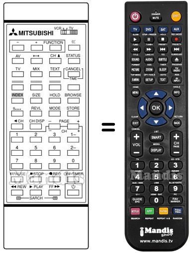 Below, we will show you the correspondence between each button on the original remote control and the button that performs the same function on the replacement remote control. In some cases, you may need to press the SHIFT key before pressing another button to perform certain actions. These additional functions are often not widely used and are included to facilitate understanding of the replacement remote control, or because the original remote control has more buttons than its equivalent.