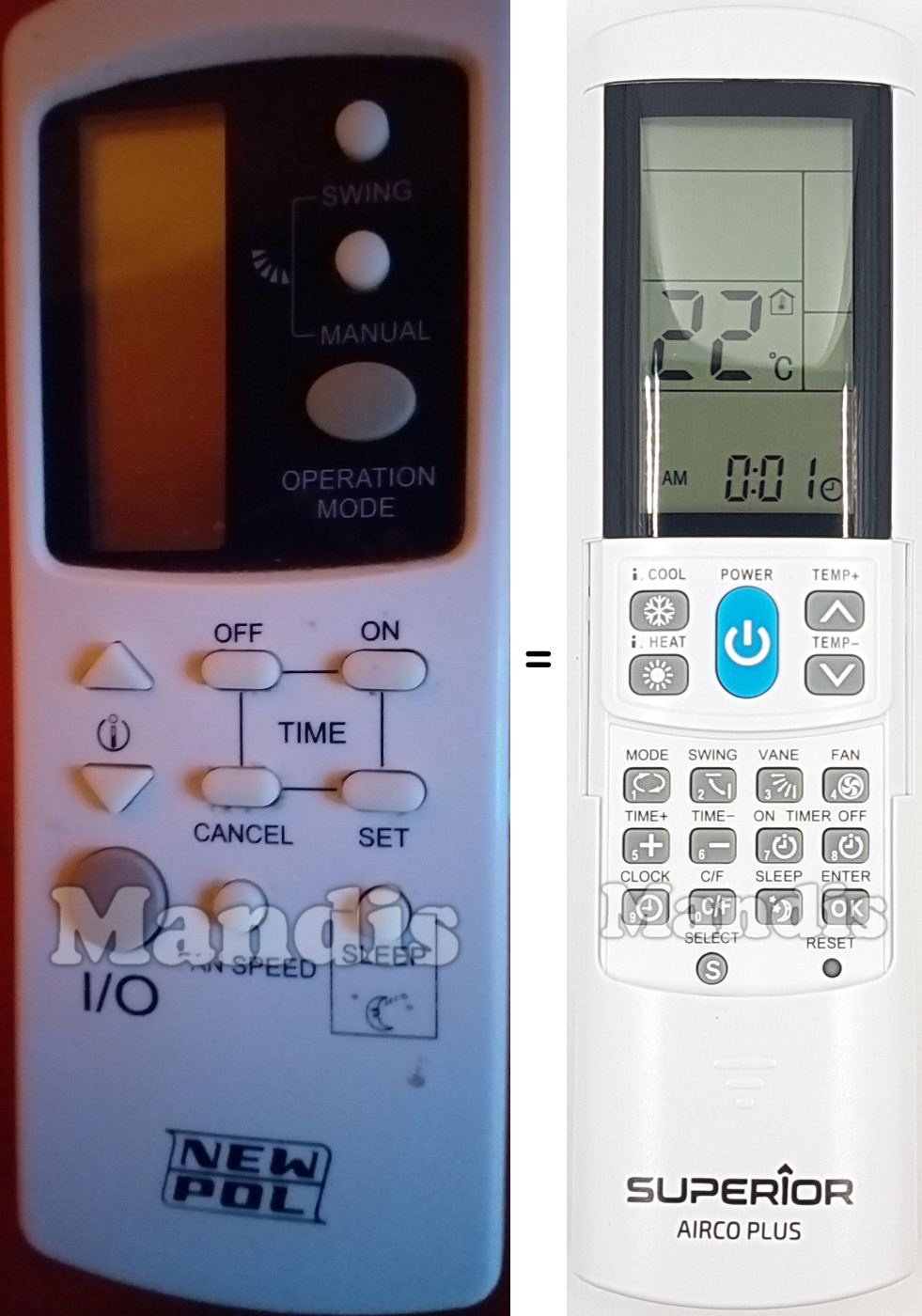 My LG air-conditioner's remote died and need replacement. AircoPlus did the job. I should point out that the code match did not correspond according to manufacturer's table. Let the auto-search code set up do the work. Also, excellent service by Mandis Remotes with a well-protected package.