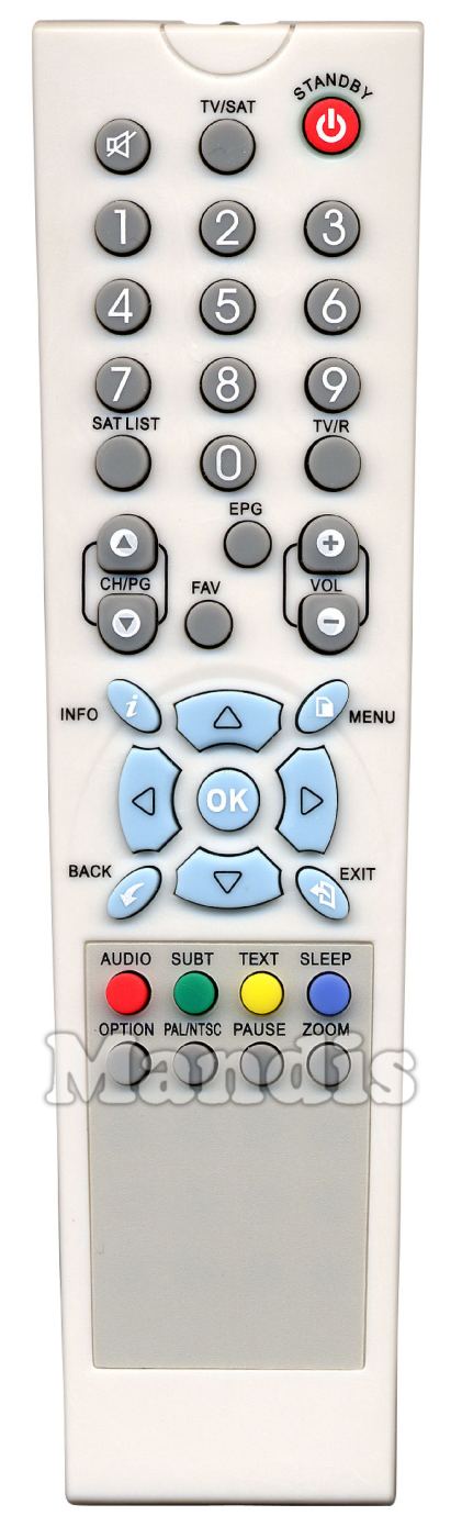 Standby, TV/SAT, Mute, 1, 2, 3, 4, 5, 6, 7, 8, 9, 0, SAT List, TV/R, CH/PG+, CH/PG-, FAV, EPG, Vol+, Vol-, Info, Menu, Up, Left, OK, Right, Down, Back, Exit, Red / Audio, Green / Subt, Yellow / Text, Blue / Sleep, Option, Pal/NTSC, Pause, Zoom
