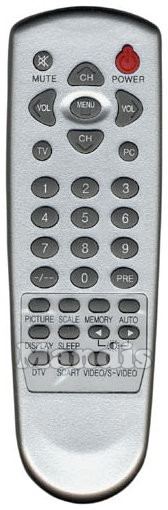 Power, Mute, Up / CH +, Down / CH -, Right / Vol +, Left / Vol -, Menu, TV, PC, 1, 2, 3, 4, 5, 6, 7, 8, 9, 0, -/--, PRE, Picture, Scale, Memory, Auto, Display, Sleep, Brightness -, Brightness +, DTV, Scart, Video / S-Video