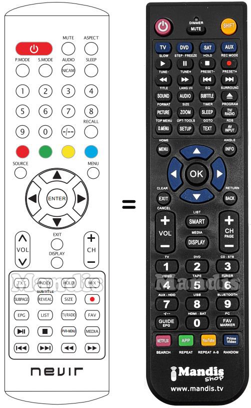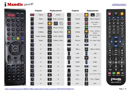 Below, we will show you the correspondence between each button on the original remote control and the button that performs the same function on the replacement remote control. In some cases, you may need to press the SHIFT key before pressing another button to perform certain actions. These additional functions are often not widely used and are included to facilitate understanding of the replacement remote control, or because the original remote control has more buttons than its equivalent.