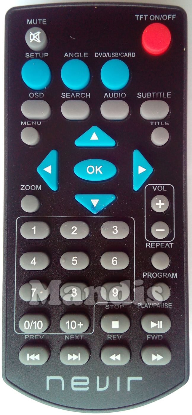 TFT On / Off, Mute, Setup, Angle, DVD / USB / Card, OSD, Search, Audio, Subtitle, Menu, Title, Up, Down, Right, Left, OK, Zoom, Vol +, Vol -, 1, 2, 3, 4, 5, 6, 7, 8, 9, 0 / 10, 10+, Repeat, Program, Stop, Play / Pause, I<<, >>I, <<, >>