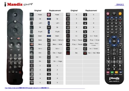 Below, we will show you the correspondence between each button on the original remote control and the button that performs the same function on the replacement remote control. In some cases, you may need to press the SHIFT key before pressing another button to perform certain actions. These additional functions are often not widely used and are included to facilitate understanding of the replacement remote control, or because the original remote control has more buttons than its equivalent.
