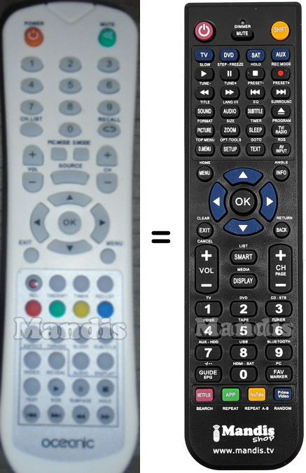 Below, we will show you the correspondence between each button on the original remote control and the button that performs the same function on the replacement remote control. In some cases, you may need to press the SHIFT key before pressing another button to perform certain actions. These additional functions are often not widely used and are included to facilitate understanding of the replacement remote control, or because the original remote control has more buttons than its equivalent.