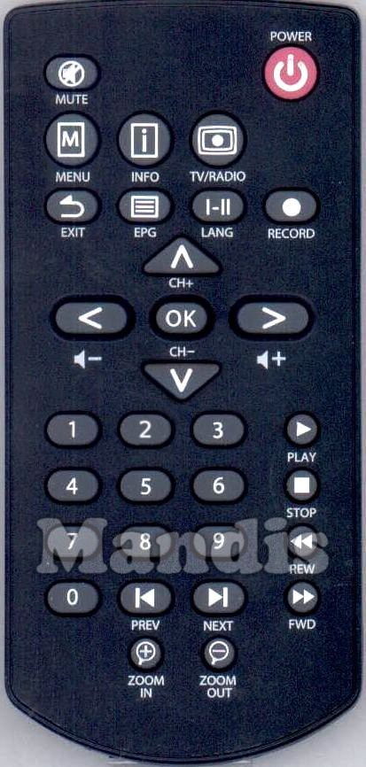 Power, Mute, Menu, Info, TV / Radio, Exit, EPG, Lang I - II, Record, Up / CH +, Down / CH -, Right / Vol +, Left / Vol -, OK, 1, 2, 3, 4, 5, 6, 7, 8, 9, 0, I< Prev, >I Next, Play, Stop, << Rew, >> Fwd, Zoom In, Zoom Out