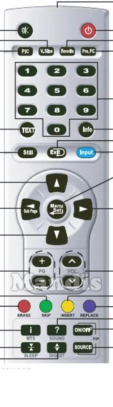 Power, Mute, PIC, V.Size, Favorite, Pre.PC, 1, 2, 3, 4, 5, 6, 7, 8, 9, 0, Text, Info, Still, Exit, Input, Up, Left / Sub Page, Menu Set / Enter, Right, Down, PG+, PG-, Vol+, Vol-, Red / Erase, Green / Skip, Yellow / Insert, Blue / Replace, i / MTS, ? / Sound, PIP On/Off, PIP Source, Hold / Sleep, Size / Digest