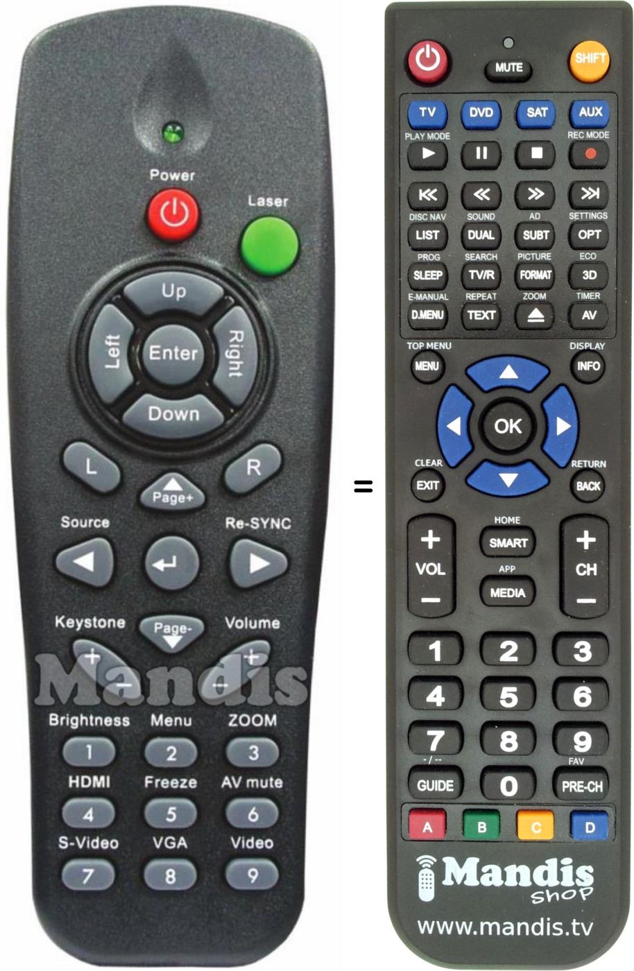 Below, we will show you the correspondence between each button on the original remote control and the button that performs the same function on the replacement remote control. In some cases, you may need to press the SHIFT key before pressing another button to perform certain actions. These additional functions are often not widely used and are included to facilitate understanding of the replacement remote control, or because the original remote control has more buttons than its equivalent.