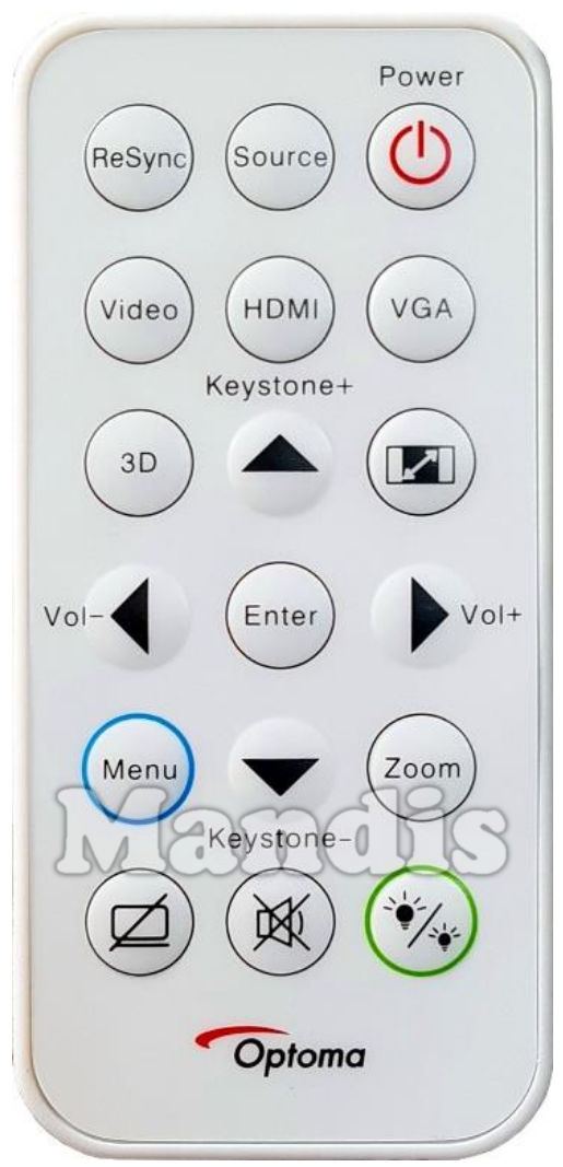 ReSync, Source, Power, Video, HDMI, VGA, 3D, Up/Keystone+, I[↨]I, Vol-/Right, Enter, Vol+/Left, Menu, Down/Keystone-, Zoom, [/], Mute, Bright*/*