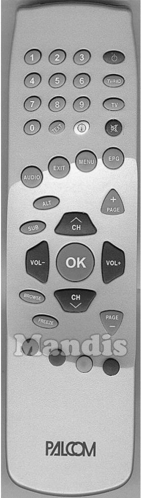 Power, 1, 2, 3, 4, 5, 6, 7, 8, 9, 0, Text, i, TV/Rad, TV, Mute, Audio, Exit, Menu, EPG, ALT, SUB, Page+, Page-, Browse, Freeze, Up / CH+, Down / CH-, Right / Vol+, Left / Vol-, OK, Red, Green, Yellow, Blue