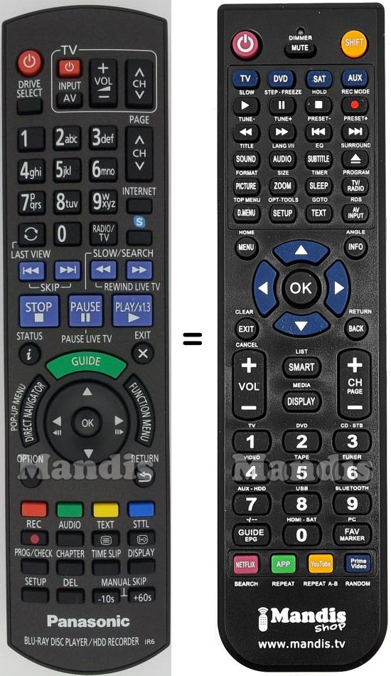 Below, we will show you the correspondence between each button on the original remote control and the button that performs the same function on the replacement remote control. In some cases, you may need to press the SHIFT key before pressing another button to perform certain actions. These additional functions are often not widely used and are included to facilitate understanding of the replacement remote control, or because the original remote control has more buttons than its equivalent.
