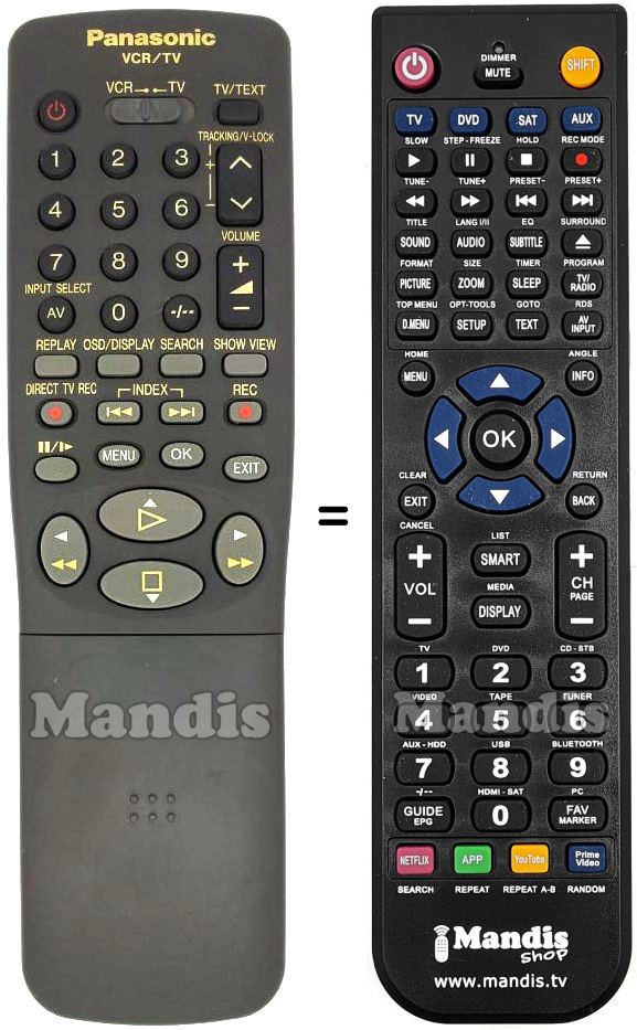 This remote control performs all the functions of the original remote control: Power, Tv/Text, 1, 2, 3, 4, 5, 6, 7, 8, 9, 0, AV/Input Select, Tracking/V-Lock+, Tracking/V-Lock-, Vol+, Vol-, -/--, Replay, OSD/Display, Search, Show View, Direct Tv Rec, I<<, >>I, Rec, Pause/Step, Menu, OK, Exit, Play/Up, Stop/Down, >>/Right, <</Left, Prog/Check+, Prog/Check-, Date+, Date-, On+, On-, Off+, Off-, Prog/Check, Cancel, Nothing1, Timer Rec, Reset, Nothing2, Nothing3, VPS/PDC, AV Link, Tv Aspect