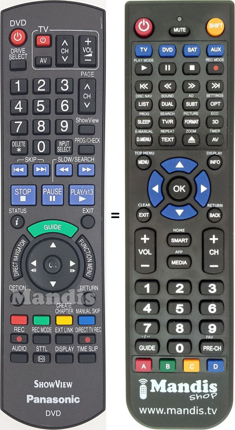 This remote control performs all the functions of the original remote control: DVD Power, Drive Select, TV Power, TV AV, TV CH +, TV CH -, TV Vol +, TV Vol -, 1, 2, 3, 4, 5, 6, 7, 8, 9, 0, Delete *, Input Select, CH + / Page +, CH - / Page -, ShowView, Prog / Check, I<< Skip, Skip >>I, << Search, Search >>, Stop, Pause / Slow, Play / x1.3, i / Status, Exit, Guide, Direct Navigator, Function Menu, Up, Down, Right / II>, Left / <II, OK, Option, Return, Red, Green, Yellow / Create Chapter, Blue / Manual Skip, Rec, Rec Mode, Ext Link, Direct TV Rec, Audio, STTL, Display, Time Slip