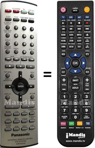 This remote control performs all the functions of the original remote control: Power, AV System Power, TV, VCR / AUX, Sleep, TV / AV, Tuner / Band, DVD / CD, FL Display - Dimmer, Play Mode - Mix 2CH, Repeat, Position Memory, 1, 2, 3, 4, 5, 6, 7, 8, 9, 0, Cancel, ≧10 / -/--, I<< Skip / CH -, >>I Skip / CH +, << / Slow/Search -, >> / Slow/Search +, Stop, Pause, Play, Top Menu / Direct Navigator, Menu / Playlist, Up, Right, Down, Left, Enter, Display / TV Vol -, Return / TV Vol +, Volume -, Volume +, Muting, C.S.M, SFC, SubWoofer Level, S.SRND, Dolby Digital PL, C.Fopcus, CH Select - Test, FM Mode Setup, Zoom, Group, Audio