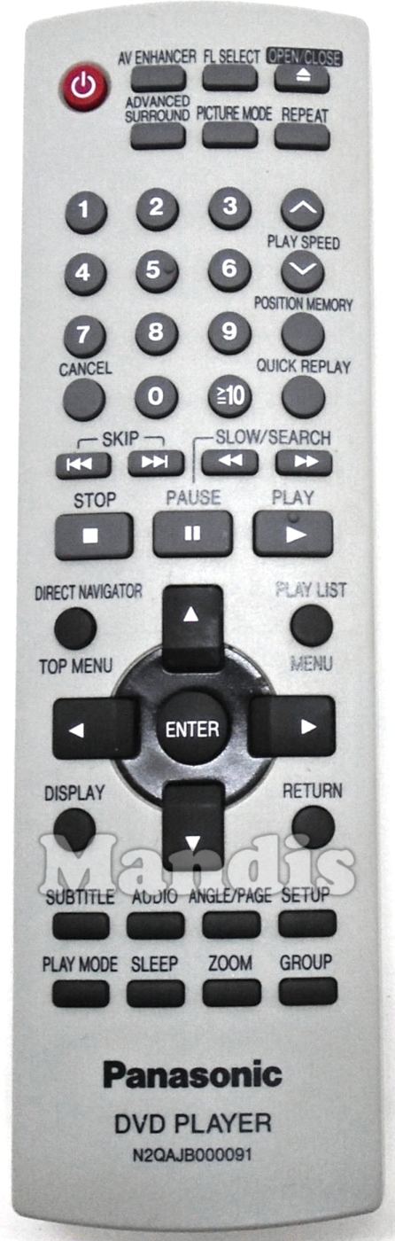 Power, AV Enhancer, FL Select, Open / Close, Advanced Surround, Picture Mode, Repeat, 1, 2, 3, 4, 5, 6, 7, 8, 9, 0, Cancel, ≧10, ᐱ Play Speed +, ᐯ Play Speed -, Position Memory, Quick Replay, ▮◀◀ Skip, ▶▶▮ Skip, ◀◀ Slow/Search, ▶▶ Slow/Search, ◼ Stop, ▮▮ Pause, ▶ Play, Direct Navigator / Top Menu, Play List / Menu, Up, Left, Enter, Right, Down, Display, Return, Subtitle, Audio, Angle / Page, Setup, Play Mode, Sleep, Zoom, Group