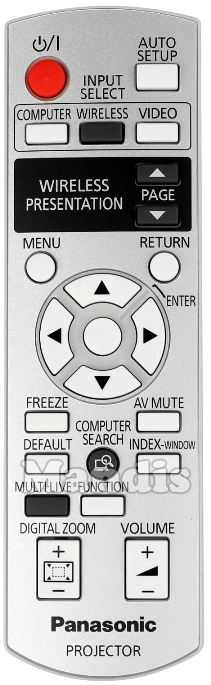 Power, Auto Setup, Computer, Wireless, Video, Page+, Page-, Menu, Return, Up, Left, Enter, Right, Down, Freeze, AV Mute, Default, Computer Search, INDEX-window, Multi-Live, Function, Digital Zoom+, Digital Zoom-, Volume+, Volume-