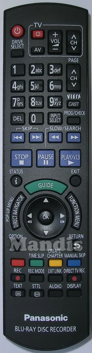 TV Power, TV AV, TV Vol +, TV Vol -, TV CH +, TV CH -, Power, Drive Select, 1, 2, 3, 4, 5, 6, 7, 8, 9, 0, Ch + / Page +, Ch - / Page -, Cast / Viera, Del, Input Select, Prog / Check, I<<, >>I, <<, >>, Stop, Pause, Play / x1.3, i / Status, Exit, Guide, Direct Navigator / Pop-Up Menu, Function Menu, Up, Right, Down, Left, OK, Option, Return, Red, Green / Time Slip, Yellow / Create Chapter, Blue / Manual Skip, Rec, Rec Mode, Exit Link, Direct TV Rec, Text, STTL, Audio, Display