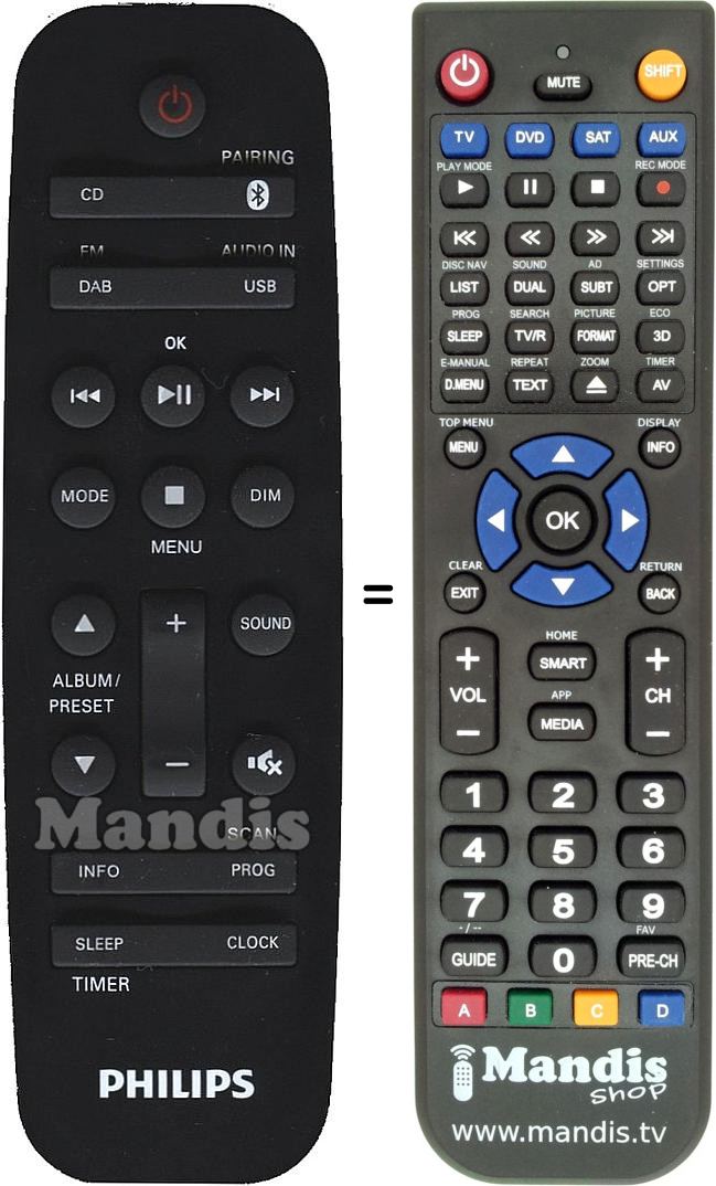 Below, we will show you the correspondence between each button on the original remote control and the button that performs the same function on the replacement remote control. In some cases, you may need to press the SHIFT key before pressing another button to perform certain actions. These additional functions are often not widely used and are included to facilitate understanding of the replacement remote control, or because the original remote control has more buttons than its equivalent.