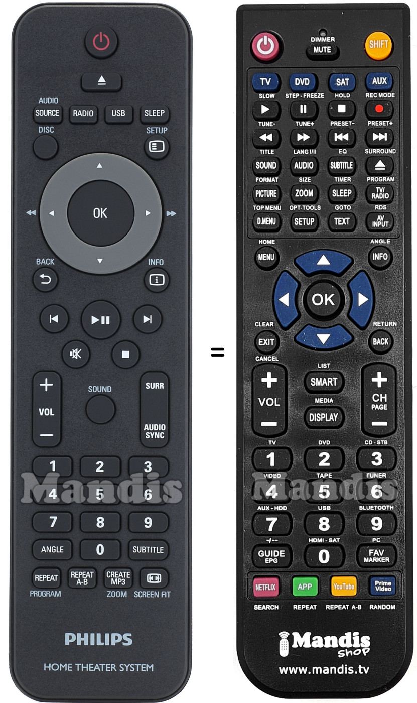 This remote control performs all the functions of the original remote control: Power, Eject, Source/Audio, Radio, USB, Sleep, Disc, [= ]/Setup, Back, [i]/Info, OK, Up, Down, Right/>>, Left/<<, I<, >I, Mute, Stop, Play/Pause, Vol+, Vol-, Surr, Audio Sync, Sound, 1, 2, 3, 4, 5, 6, 7, 8, 9, 0, Angle, Subtitle, Repeat/Program, Repeat A-B, Create MP3/Zoom, [<>]/Screen Fit