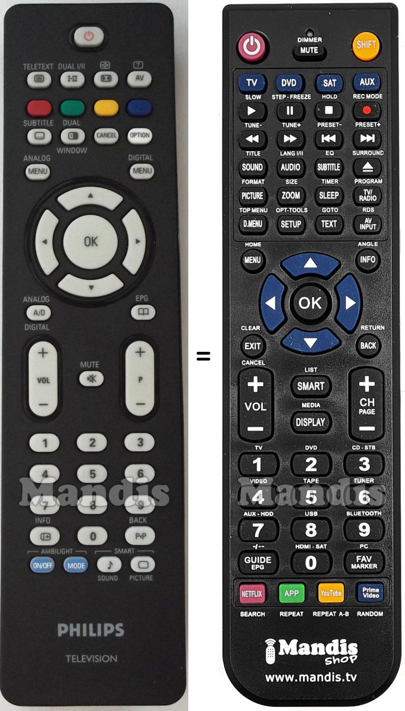 This remote control performs all the functions of the original remote control: Power, Teletext, Dual I / II, , AV, Red, Geen, Yellow, Blue, Subtitle, Dual Window, Cancel, Option, Menu Analog, Menu Digital, Up, Right, Down, Left, OK, Analog / Digital, EPG, Vol +, Vol -, Mute, P +, P -, 1, 2, 3, 4, 5, 6, 7, 8, 9, 0, Info, P<P / Back, Ambilight ON/OFF, Ambilight Mode, Sound, Picture